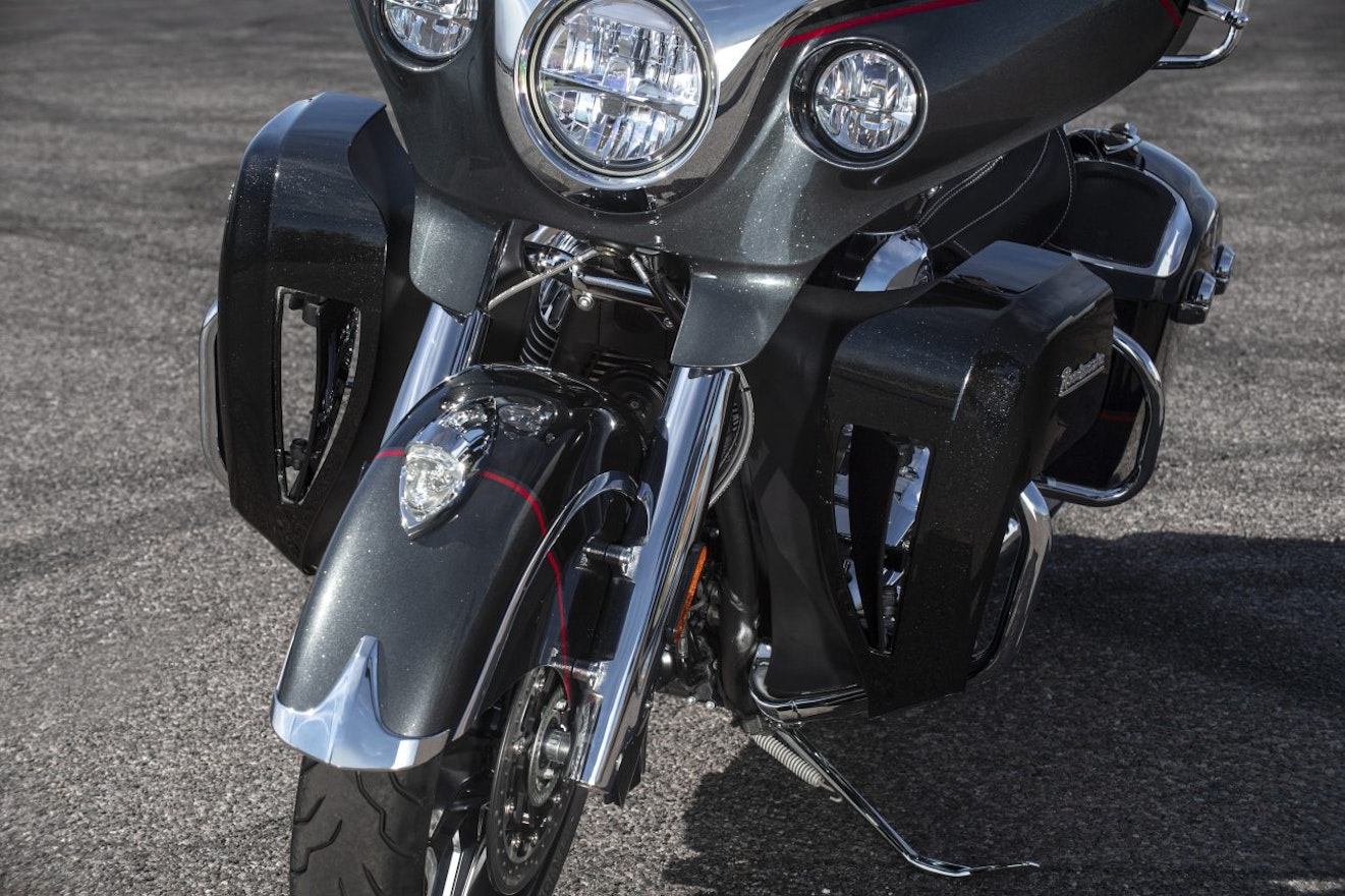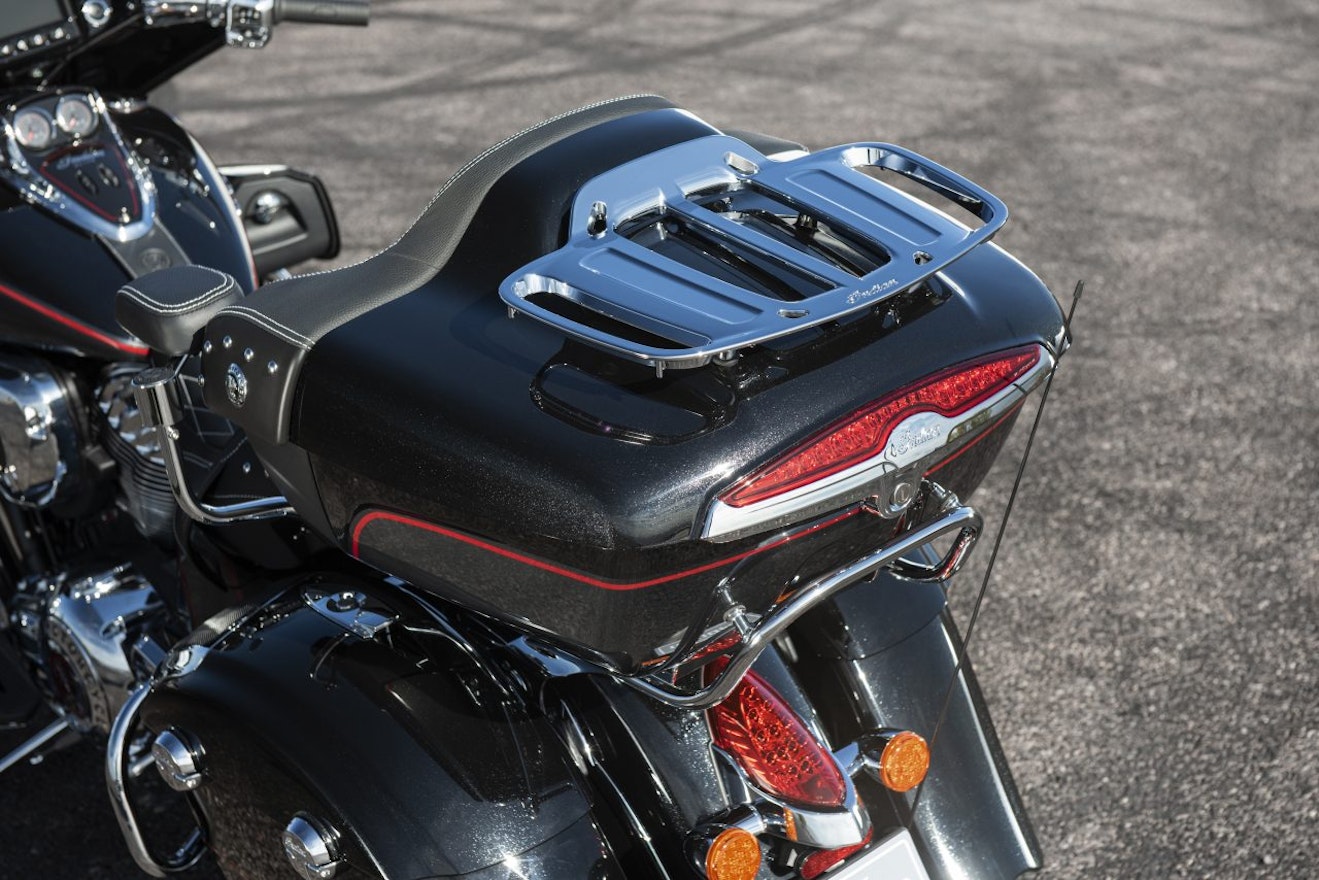 Is de ‘gewone’ Roadmaster al vrij luxueus dan is de Roadmaster Elite ‘super-deluxe’. Dat komt vooral tot uiting in de manier waarop de Elite-versie afgewerkt is. Voor de kleurstelling koppelt Indian Gunmetal Flake aan Thunder Black Vivid Crystal. Rode accenten – striping en op oa de klepstoterbuizen – maken het geheel af. Zoals we dat van Elite-modellen van Indian Motorcycle gewend zijn, gebeurt de beschildering handmatig! Daarnaast vallen de voor- en achterbumper in chroom, de premium treeplanken, de armleuningen voor de passagier en de pinnacle spiegels op.