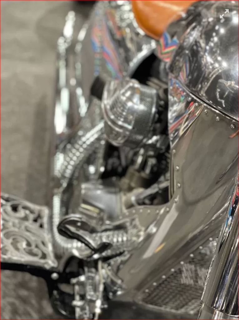 De glimmende Harley Davidson is custom made (speciaal gemaakt) voor Stef van der Bijl. De kunstenaar en ontwerper is geboren in Deventer. Hij is opgegroeide bij zijn artistieke moeder en zijn vader werkte in de auto-industrie. Sinds 2005 heeft hij een studio in Amsterdam waar hij deze twee werelden combineert. Zo vind je in zijn atelier meubels van auto- en luchtvaartonderdelen en een grote collectie van opmerkelijke verlichting. De tank is een straatlantaarn die ’s nachts omver was gereden. Stef had toevallig een inbussleutel bij zich, aldus Bas Jansen.