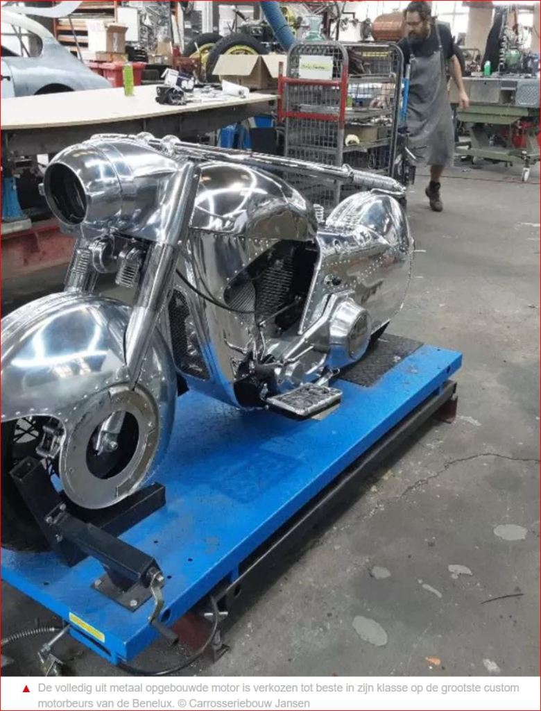 De van voor tot achter glimmende Harley Davidson is ontworpen door Stef van der Bijl, geboren in Deventer. De mannen van Jansen Restorations uit Wesepe hebben de motor volgens dat ontwerp gemaakt. Een succesformule, want de volledig uit metaal opgebouwde tweewieler is verkozen tot beste in zijn klasse op de grootste custom motorbeurs van de Benelux. Wat je dan wint? ,,De komende vijf jaar mogen we op alle motorshows van de wereld staan.’’