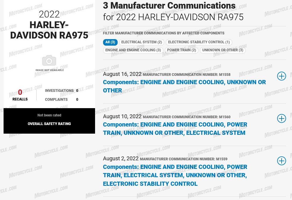 Verder bewijs komt naar ons toe via de pagina Veiligheidsproblemen en terugroepacties van de NHTSA. Op deze pagina kunnen mensen terugroepacties, veiligheidsonderzoeken, klachten van consumenten en mededelingen van fabrikanten opzoeken in het systeem van NHTSA. Als u op het moment van schrijven op het tabblad Voertuig klikt en zoekt naar “RA975” of “RA975S”, vindt u drie servicebulletins voor een Harley-Davidson RA975 en RA975S uit 2022.