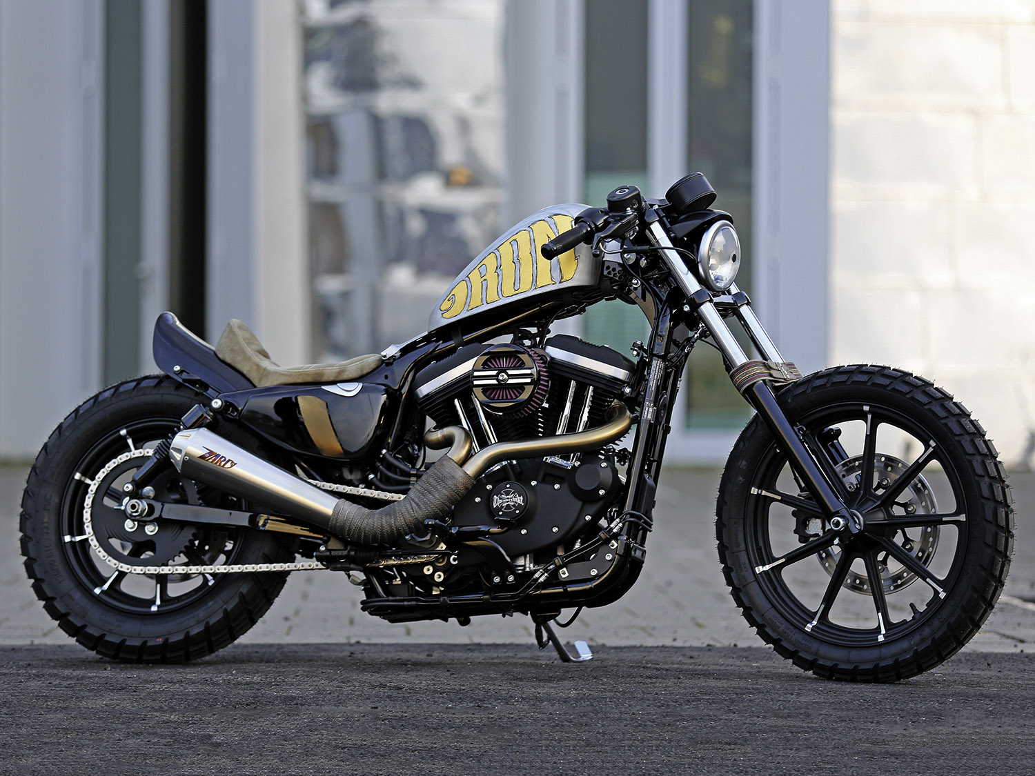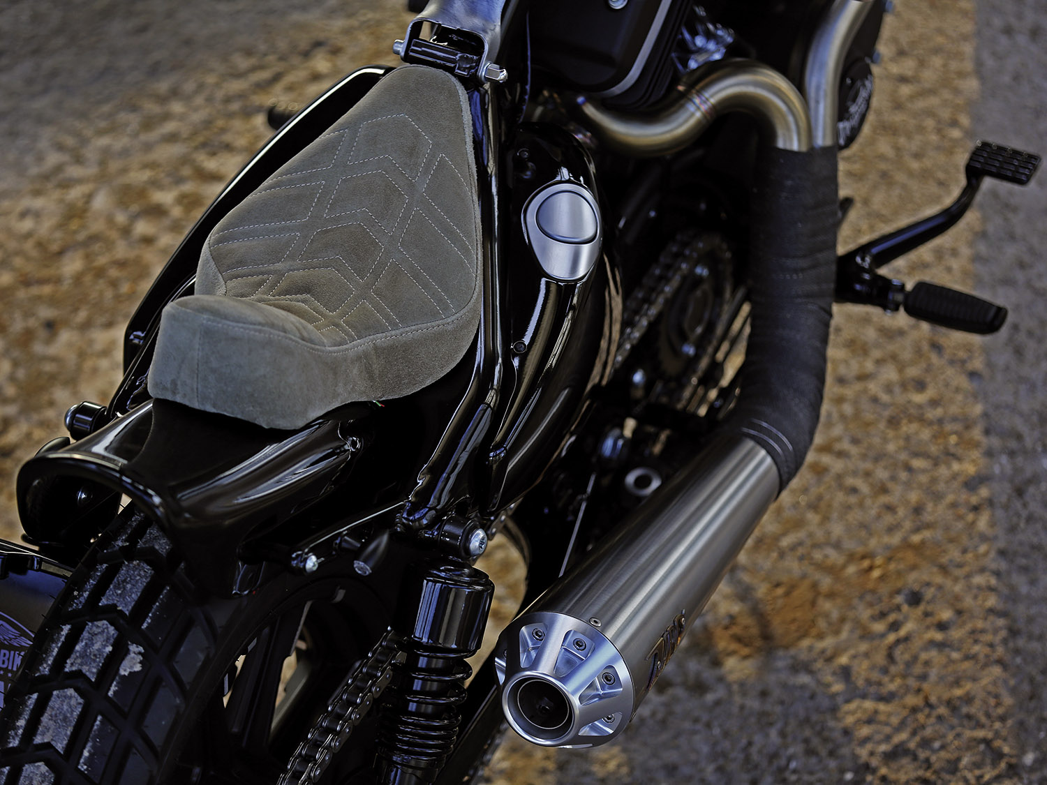 Natuurlijk is er ook nog de TÜV, want alleen de achterste modificatie met de vermelding op het solozadel, het stuur en de kentekenplaathouder zijn registratie plichtig. De rest is geschroefd met geteste onderdelen, waarvan sommige ook in kleine series worden geproduceerd. Oh ja, nog een ding: de coole wielen zijn af fabriek gemonteerd op de Iron 883. Het was bijna een toegift uit Milwaukee.