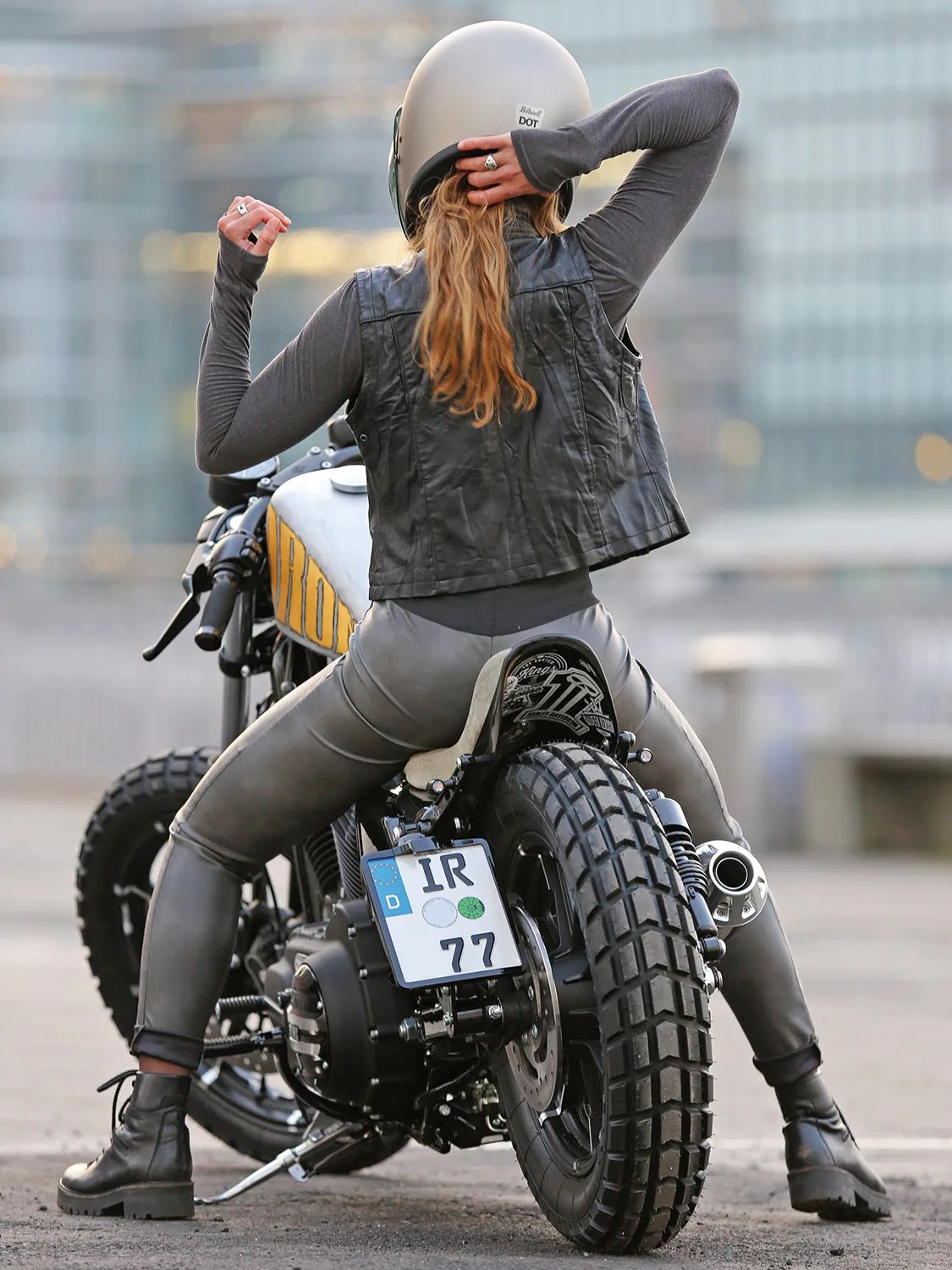 Men zou een Mini-Ape-stuur verwachten wat zou moeten zorgen voor een goede armpositie op een motor als deze, maar verre van dat. Kim wil liever een korte dragbar hebben die ondersteboven gemonteerd kan worden, zo geschied. En de zithouding? “Verrassend goed”, bevestigt Andreas. “Dankzij de mid shifts kan Kim heel gemakkelijk bij het stuur en heeft ze er geen problemen mee.”