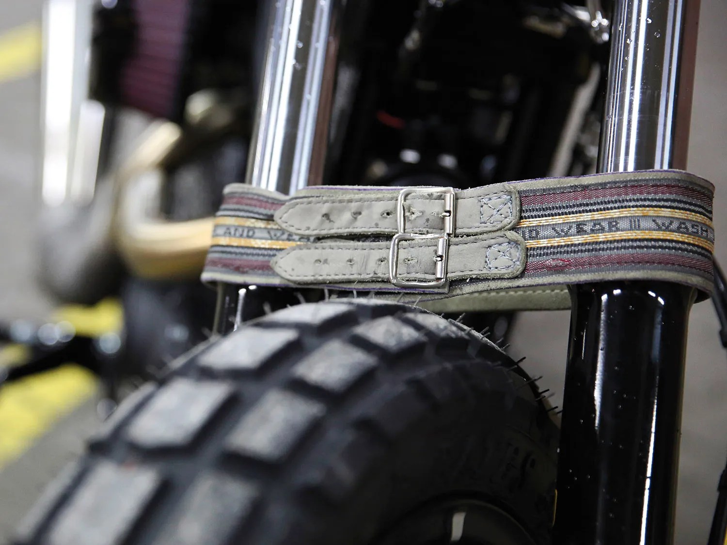 “De zadel bekleding was in een vorig leven een driekwart ‘lederhose’ die Andreas op eBay kocht. Na een zinloos bestaan gebruiken Kim en Andreas het leer voor een nieuw doel. “We hebben het gewoon gesneden, omgedraaid en er een stoelbekleding van gemaakt. Om de typische, hellende helikopterlijn te krijgen, kiezen de twee voor een aangepaste Sportster-tank die wordt verhoogd. Er gaat nog geen acht liter brandstof in, maar het uiterlijk is beter dan dat van het originele onderdeel van de 883.