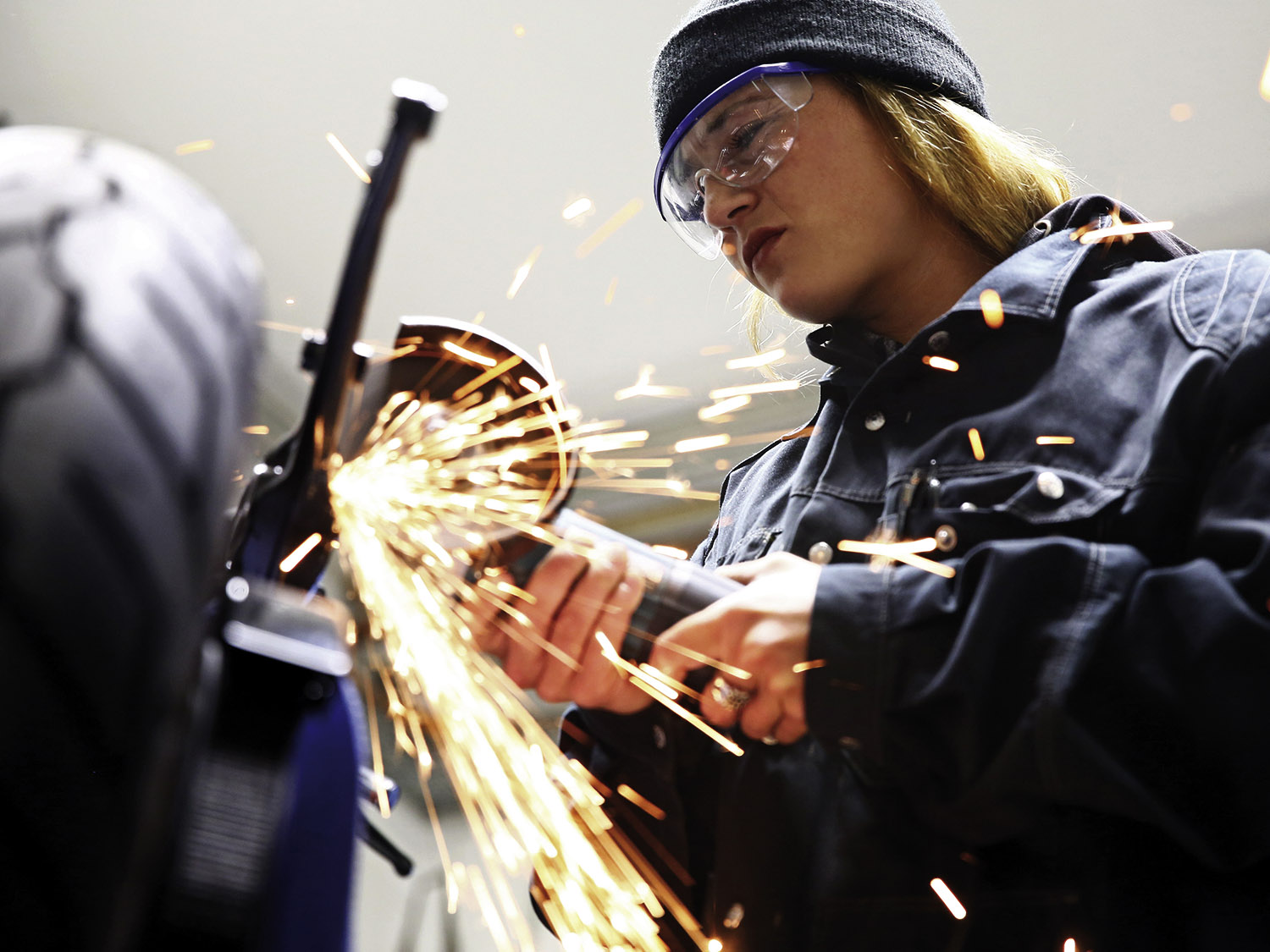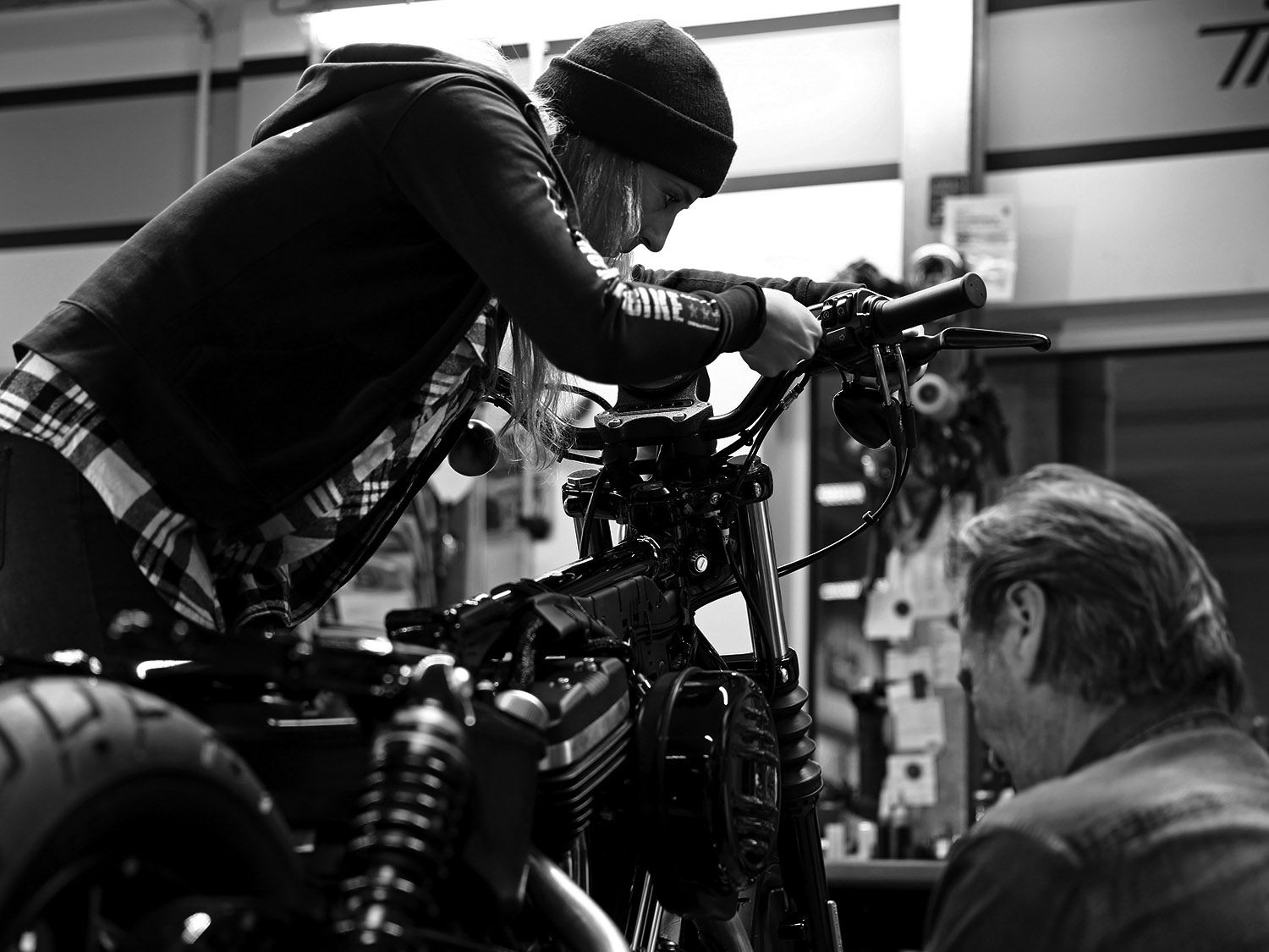The Iron is Kim’s favoriet geworden. Zelfs sleutelen verbind. ‘Ja, ze mag de motor houden. Voor nu«, grinnikt Andreas. Een tweede fiets op basis van de 883 is al in aanbouw. Als je nu geïnteresseerd bent in een custom bike in de stijl van Kim’s »The Battle of the Kings«-883-Iron, weet je nu waar je moet zijn. Voor een productie Sportster moet je zelf zorgen, want die zijn helaas niet meer leverbaar.