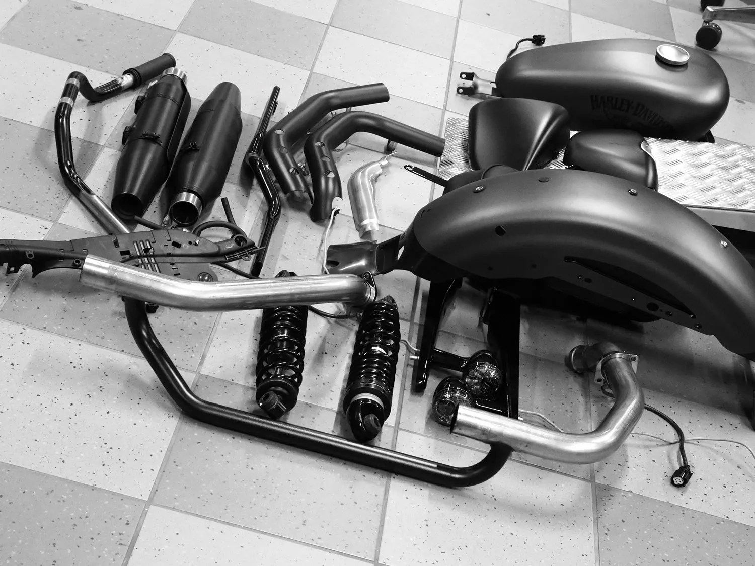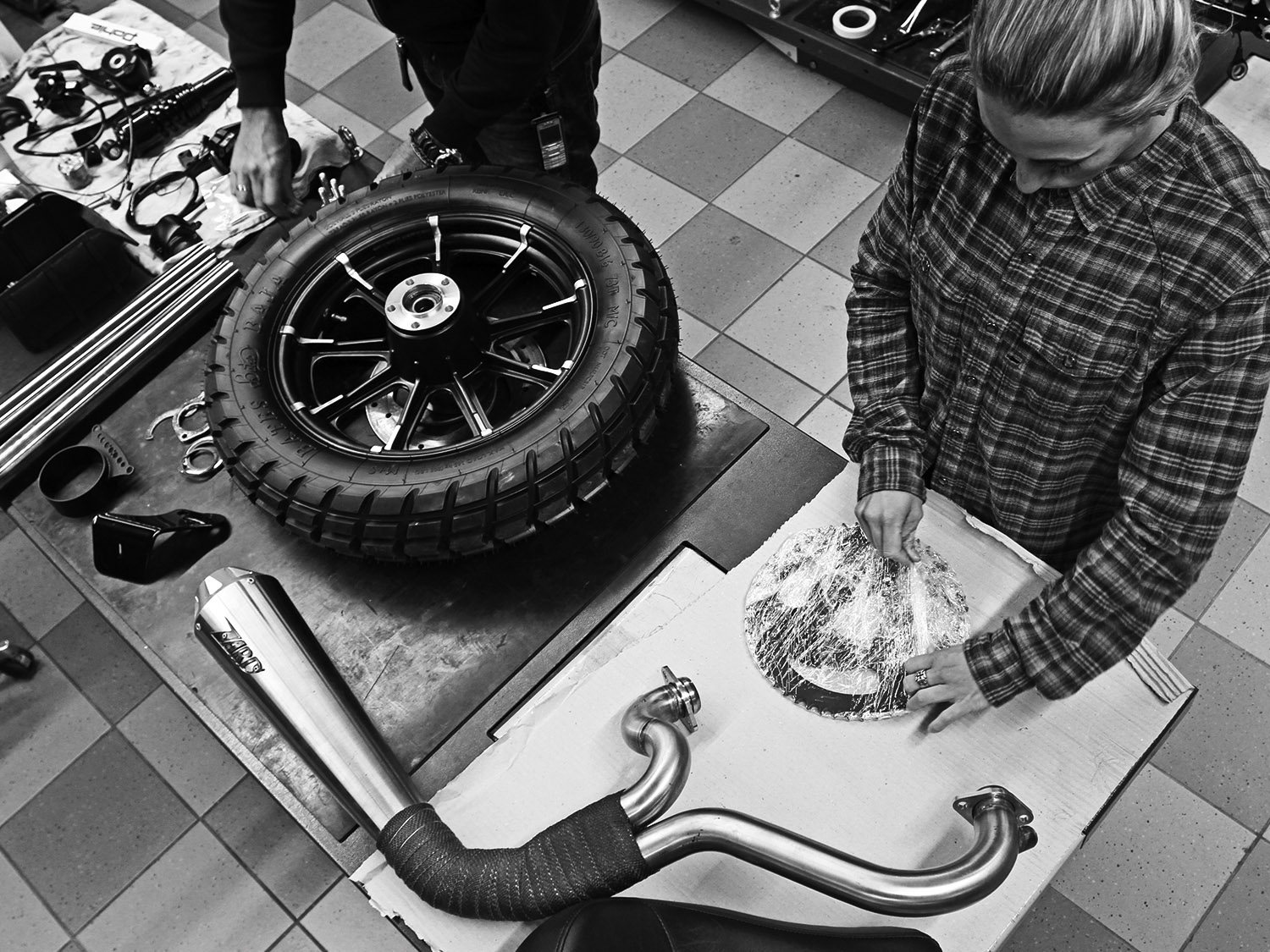 Kim en Andreas proberen dingen uit, halen onderdelen van de motor, gooien ze weg en beginnen opnieuw. Op een gegeven moment ontwikkelde zich een duidelijk beeld van de nieuwe 883. Korte staart, hoog zittende tank, laag stuur – en vooral spijkerbanden. Een ‘dirty dragstyle’ chopper moet het worden. Vanaf nu is het pad bepaald, de customizing mechanismen treden in werking, het ene deel past in het andere. De steunen worden vervangen, voor het korte scherpe achterspatbord gedeelte. Ze weten waarschijnlijk zelf niet waarom Harley-Davidson deze modelserie na decennia nog steeds levert zonder schroefbare spatbord steunen. Ze hebben dit eeuwen geleden met de Softail veranderd. De flex is dus nodig.