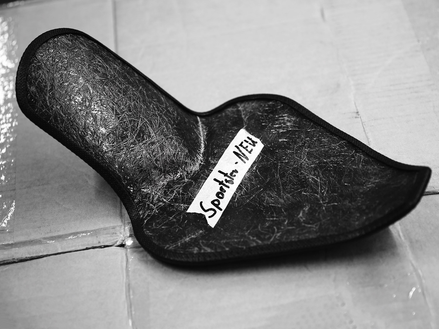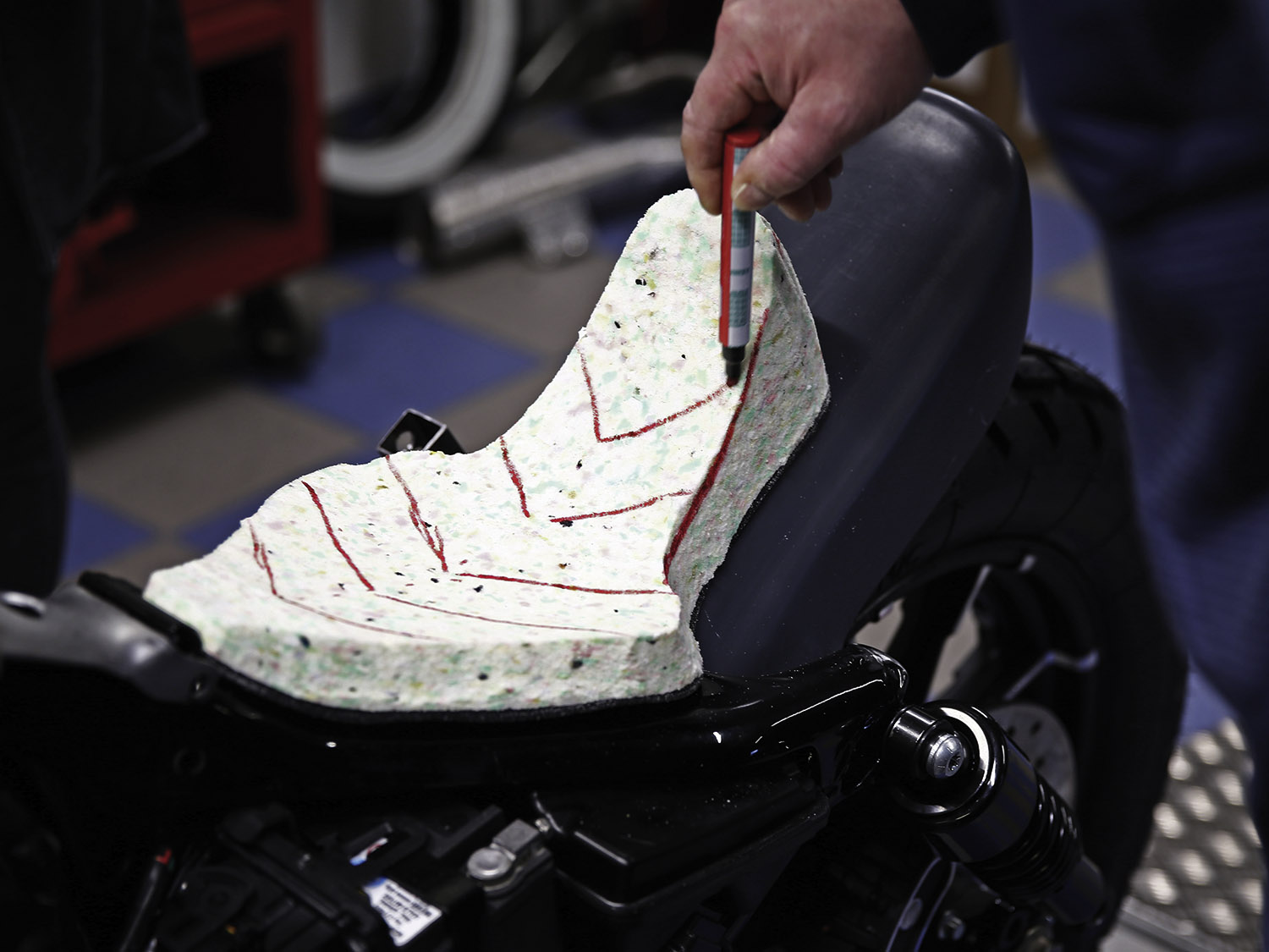 Het is de enige ingrijpende en onomkeerbare maatregel waarmee de Sportster in de toekomst op pad zal moeten gaan. Al het andere kan weer worden gewijzigd. Als achterspatbord is het spatbord van een Yamaha XV 1600 Wildstar gebruikt, dat is aangepast en er is een mal van gemaakt. Andreas heeft al een kleine serie in gedachten. Het originele zadel vliegt er ook uit. Het nieuwe zadel is minimalistisch en ziet er nogal oncomfortabel uit. De zitpositie is nu aanzienlijk lager.