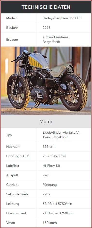 Omdat Harley-Davidson ook jongeren wil betrekken bij de ‘Custom’ King-campagne, besluit Andreas de uitdaging aan te gaan samen met zijn dochter Kim, die ook voor Thunderbike werkt. Het zal hun eerste gezamenlijke project worden. Wanneer de Iron 883 in de werkplaats staat, begint de planningsfase. Zo wordt de Sportster eerst gestript van een aantal onderdelen. Een naakte ‘bike’ is immers een beter vertrekpunt, vooral voor het bepalen van de stijlrichting. Het is het begin van een creatief proces waarin alles kan en niets hoeft.