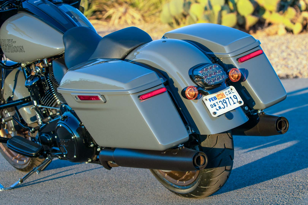 De Road Glide ST is naar voren geleund en getrimd en draagt zijn sportievere boodschap uit via zijn ontwerpkeuzes. Er is meer aan de hand dan simpelweg de RG ST met een menagerie van zwarte componenten aan te kleden, waarvan hij er veel heeft, geïnspireerd door Kyle Wyman’s kampioen winnende KOTB-racemotor. De weinige reflecterende elementen zijn te zien op de machinaal bewerkte cilinderkoppen, klepstoters en stoterstangbuizen van de M8 117. Het andere stukje van de ontwerppuzzel is wat er uit de West Coast performance bagger-cirkels komt: magere, gemene, canyon-carving V -twin machines, gezien in het terug gesneden spatbord en standaard tassen. Er zijn twee kleurstellingen beschikbaar: Vivid Black en Gunship Grey (hier getest). Standaard koffers zijn het laatste stukje van de ST-puzzel. Als je een scherpzinnige spec-sheet-onderzoeker bent, zul je merken dat de ST-toermotorfietsen dezelfde maximale hellingshoek hebben als hun standaard en speciale neven, ondanks dat is de ST in staat tot een grotere hellingshoek. Vreemd genoeg levert de meetmethode SAE J1168 dezelfde resultaten op. In de praktijk heeft de RG ST echter om een aantal redenen een beetje extra hoek voordat hij landt. Ten eerste is de rijhoogte iets hoger, terwijl de standaard koffers bodemvrijheid toevoegen.