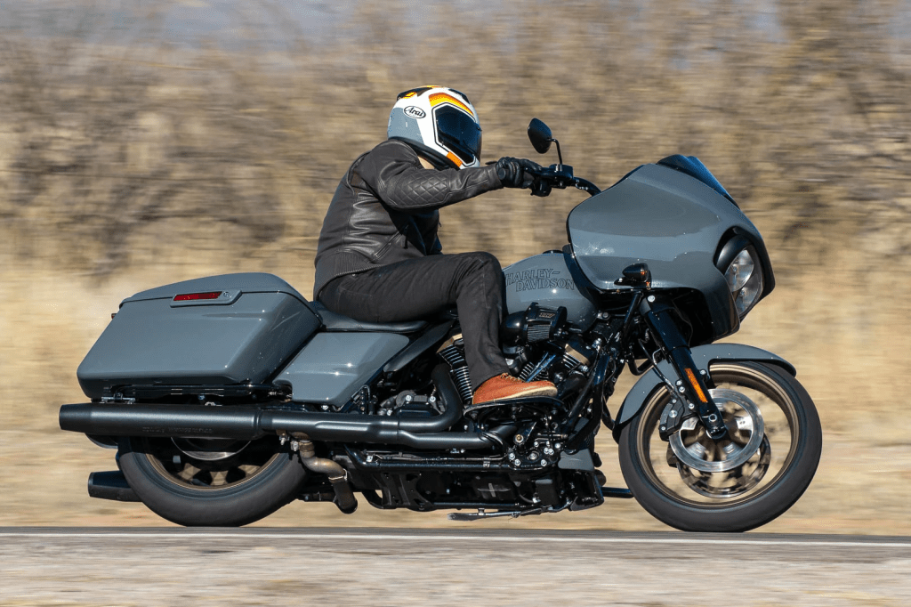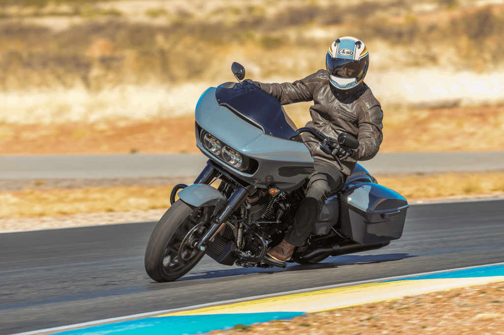 De Road Glide ST tilt zijn bochtenspel naar een hoger niveau met subtiele verbeteringen. Samenvattend is het rijgedrag van de Road Glide ST relatief eenvoudig: hij vloeit voorspelbaar in bochten, houdt een lijn vast en blijft stabiel. Een ruime wielbasis van 64 inch en een ontspannen vorkhoek van 29,25 graden creëren een standvastige, stabiele motorfiets die perfect is om mee te toeren. Wat is veranderd bij ST-modellen is bijna een extra centimeter veerweg, waardoor de achterkant omhoog komt om wat meer gretigheid op te vangen met zijn bochtencapaciteiten. De zithoogte is iets hoger, van 26,1 inch op de standaard RG en RG Special naar 26,7 inch op de ST.