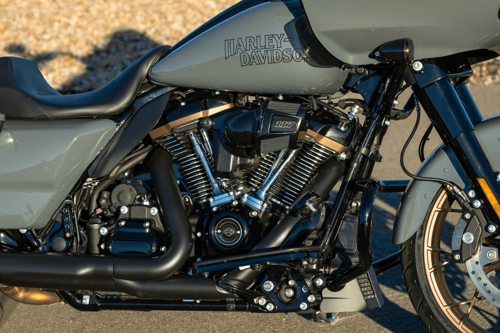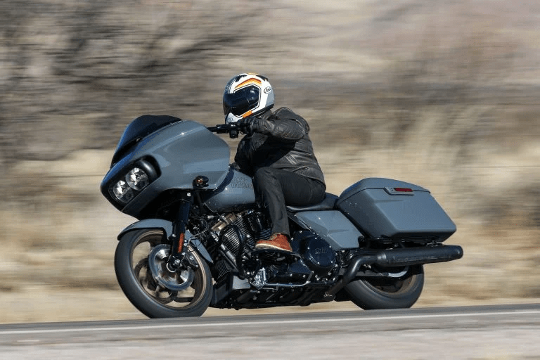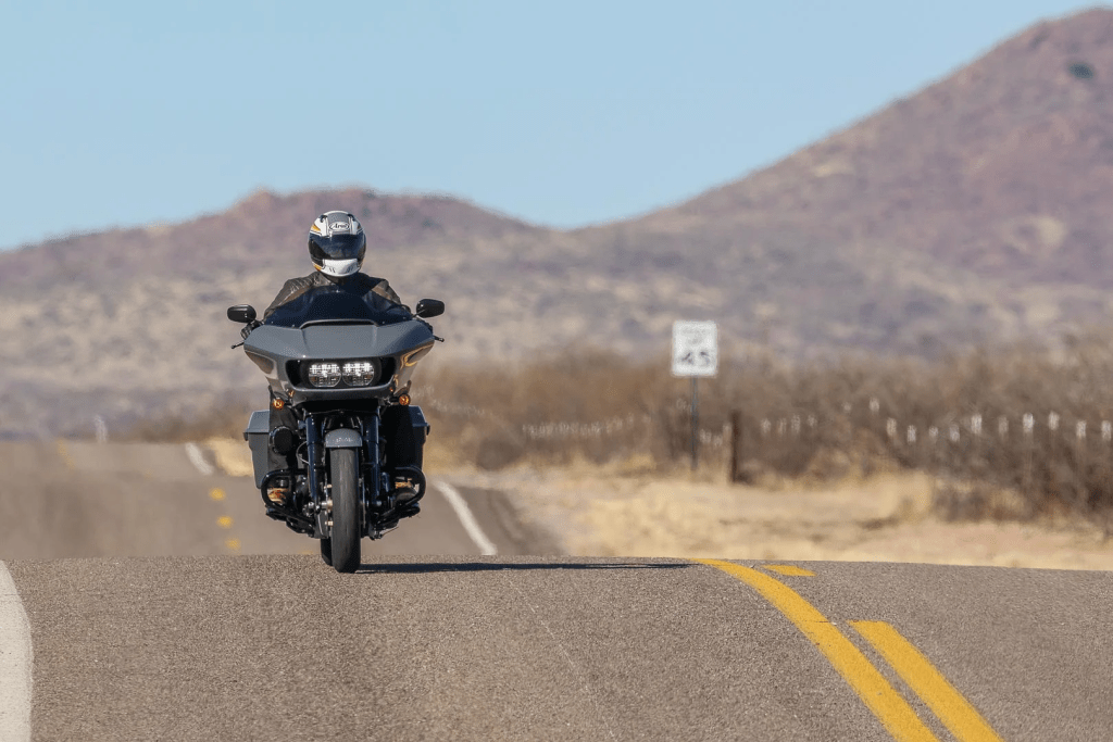 Wij (Ultimate Motorcycling) hebben de technische bochten van het circuit bij Inde Motorsports Ranch en enkele zijwegen rond Willcox, Arizona. bereden om de 2022 Harley-Davidson Road Glide ST te testen en te kijken of deze prestatiegerichte upgrades de hype waarmaken. Laten we nu verder gaan met de snelle feiten. Als een enorm koppel jouw ding is, hoef je niet verder te zoeken dan is deze Milwaukee-Eight 117ci V-twin-motor jouw ding. Zoals bij elke Amerikaanse V-twin-motorfiets, eist deze krachtbron alle aandacht op, want de M8 117 met zijn enorme koppel van 127 ft-lbs bij 3750 tpm, wat je een nobele 9 ft-lbs koppel oplevert boven het maximale vermogen van de 114 uitvoering. Een high-flow inlaat, prestatie nokkenassen en afgestemde uitlaat helpen de piekkoppelwaarden op te pompen. Al die enorme kracht is overal in het toerentalbereik beschikbaar en wordt geleverd met precies de juiste sound van het tweecilindergerommel. Met een cilinderinhoud van 1923 cc die al deze gebruiksvriendelijke stuwkracht aan de onderkant en het midden bereik oplevert, komt ook nog extra comfort in de vorm van uitstekende brandstof verbruik en beperkte hoeveelheden stralingswarmte.